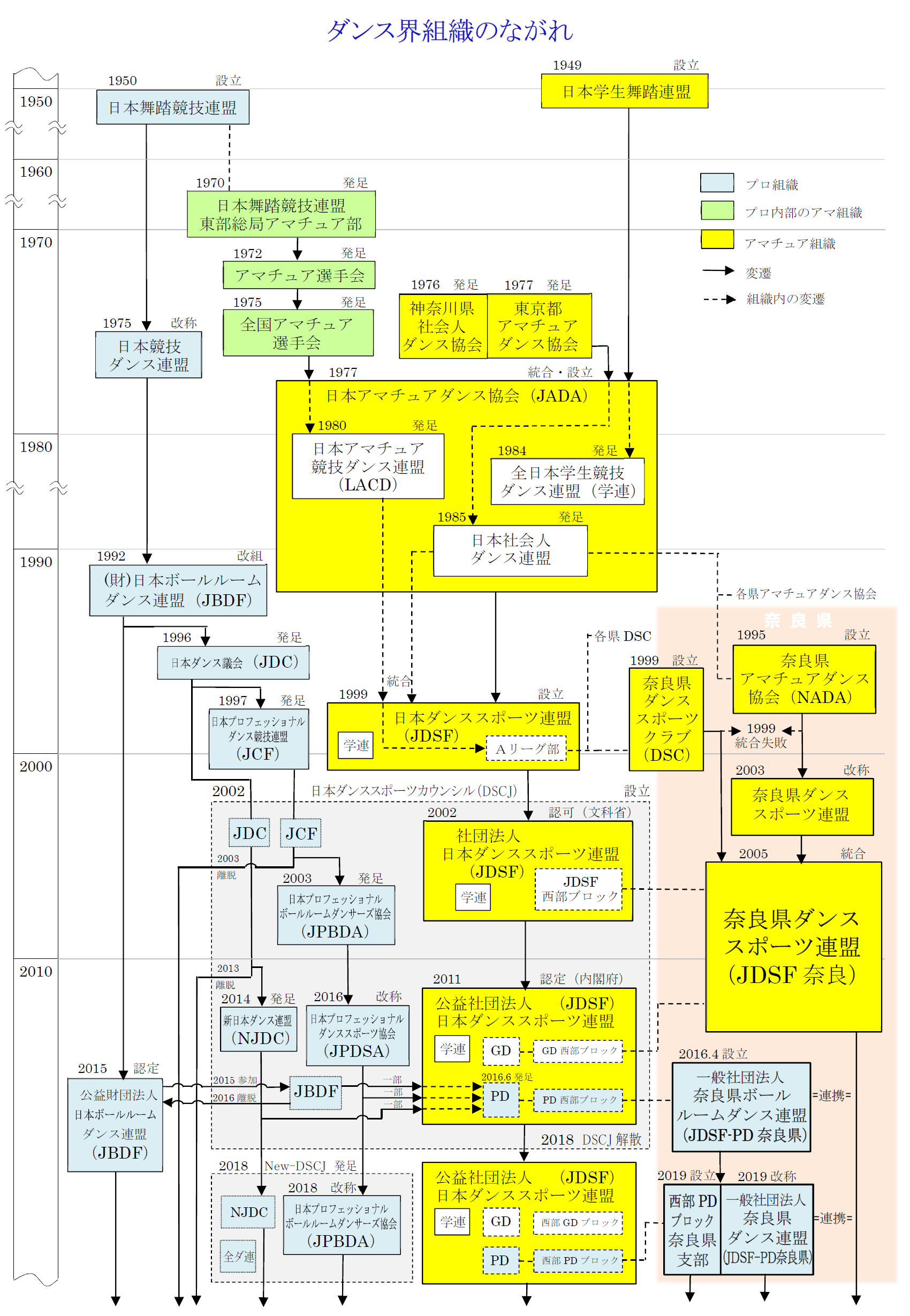 2005年 4月 奈良県ダンススポーツ連盟と奈良県ダンススポーツクラブが組織統合して、新たな奈良県ダンススポーツ連盟が発足